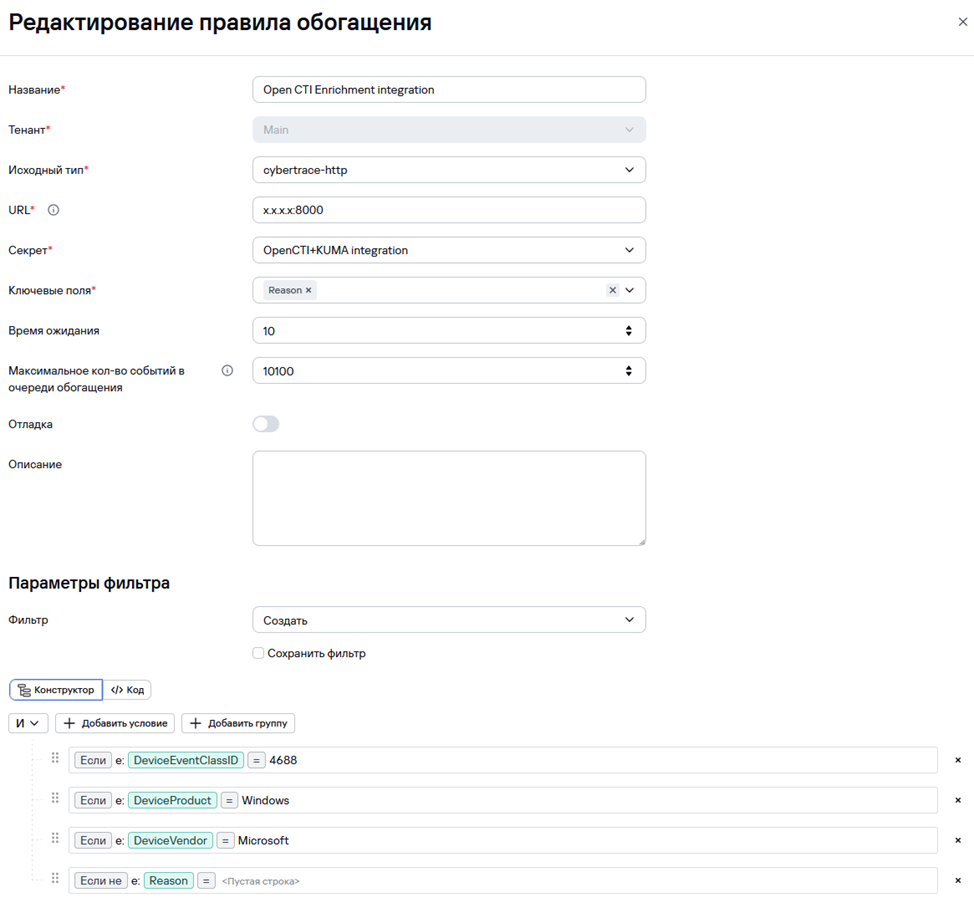 Основная задача интеграции — автоматическая проверка индикаторов компрометации (IoC), обнаруженных в событиях KUMA, по базе Threat Intelligence OpenCTI. При нахождении совпадений события дополняются контекстной информацией: описанием индикатора, источником, уровнем доверия и связанными аналитическими отчётами.