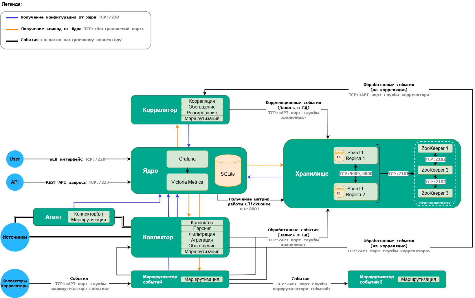 В случае если не дать доступ от Ядра до API портов служб (оранжевая стрелка), ядро не сможет отслеживать статусы служб и метрики, но события могут отправляться на корреляцию и хранение (если эти доступы открыты)