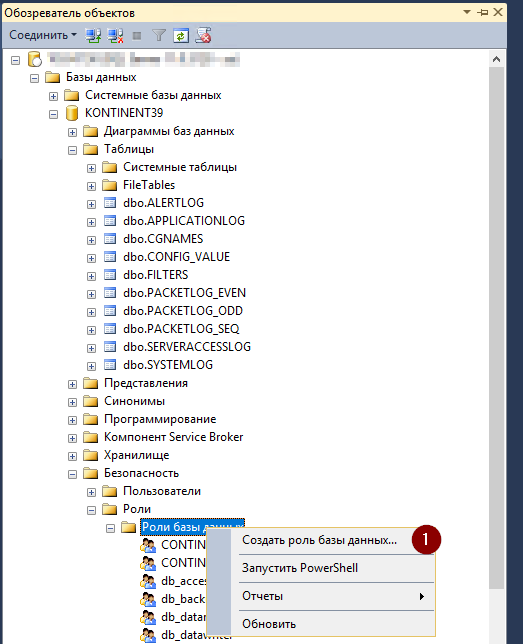 Для получения событий АПКШ Континент 3.9 из MS SQL требуется учетная запись с минимальным набором прав для подключения и чтения данных в таблицах: ALERTLOG, SERVERACCESSLOG, SYSTEMLOG, PACKETLOG, FILTERS. Чтобы создать учетную записьроль для работыдоступа ск MSтаблицам SQLБД АПКШ Континент выполните следующие действия: