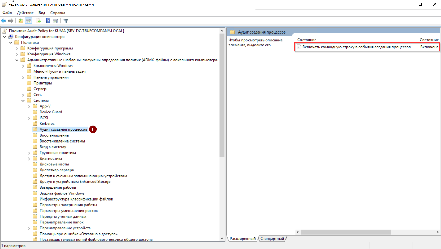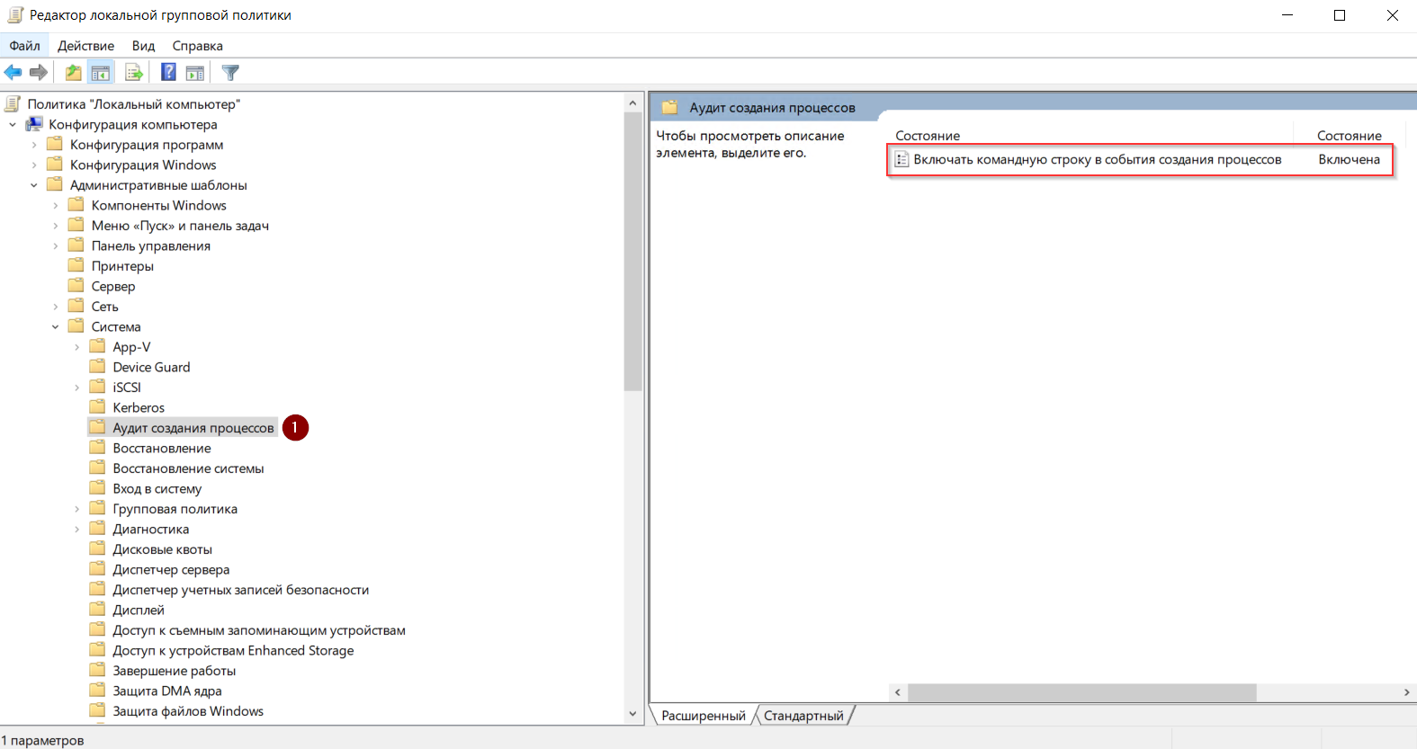 - Активируйте параметр политики Включать командную строку в события создания процессов.