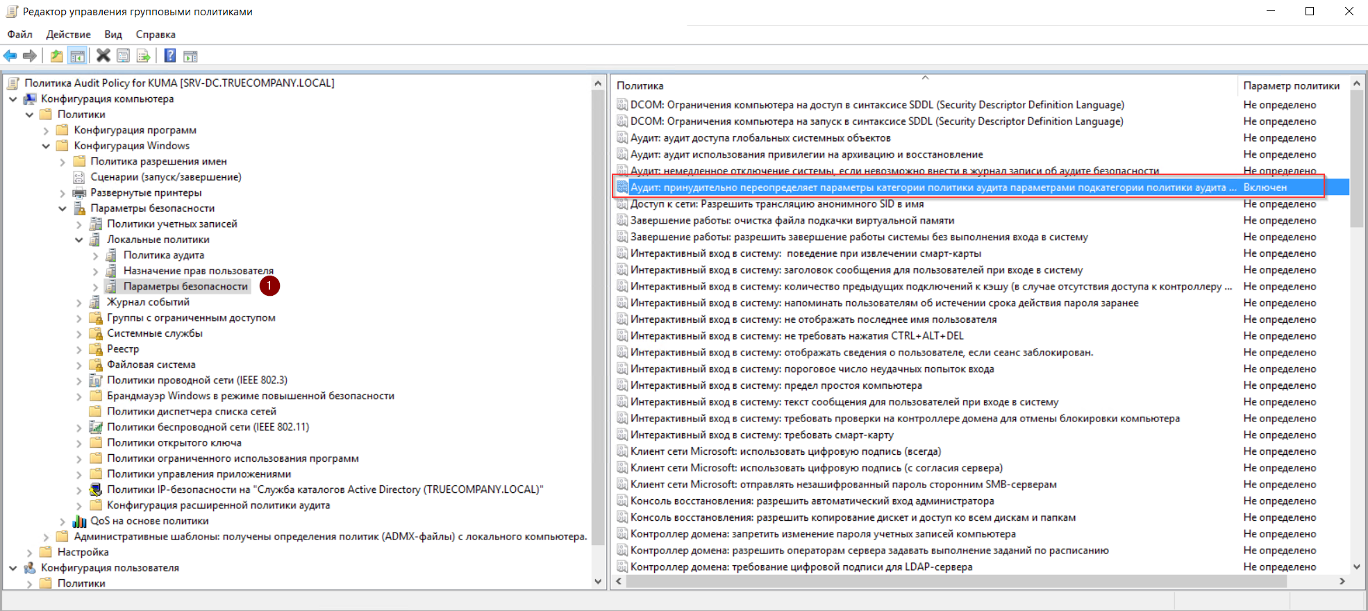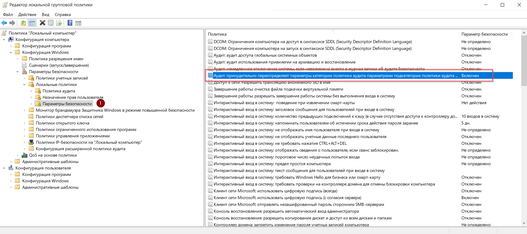 При использовании Расширенной политики аудита необходимо включить параметр "Аудит: принудительное переопределение параметров категории политики аудита параметрами подкатегории политики аудита (Windows Visa или более поздние версии) в целях переопределения параметров, указанных в Политике аудита.