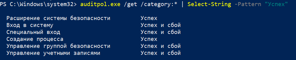 auditpol.exe /get /category:* | Select-String -Pattern "Успех"
