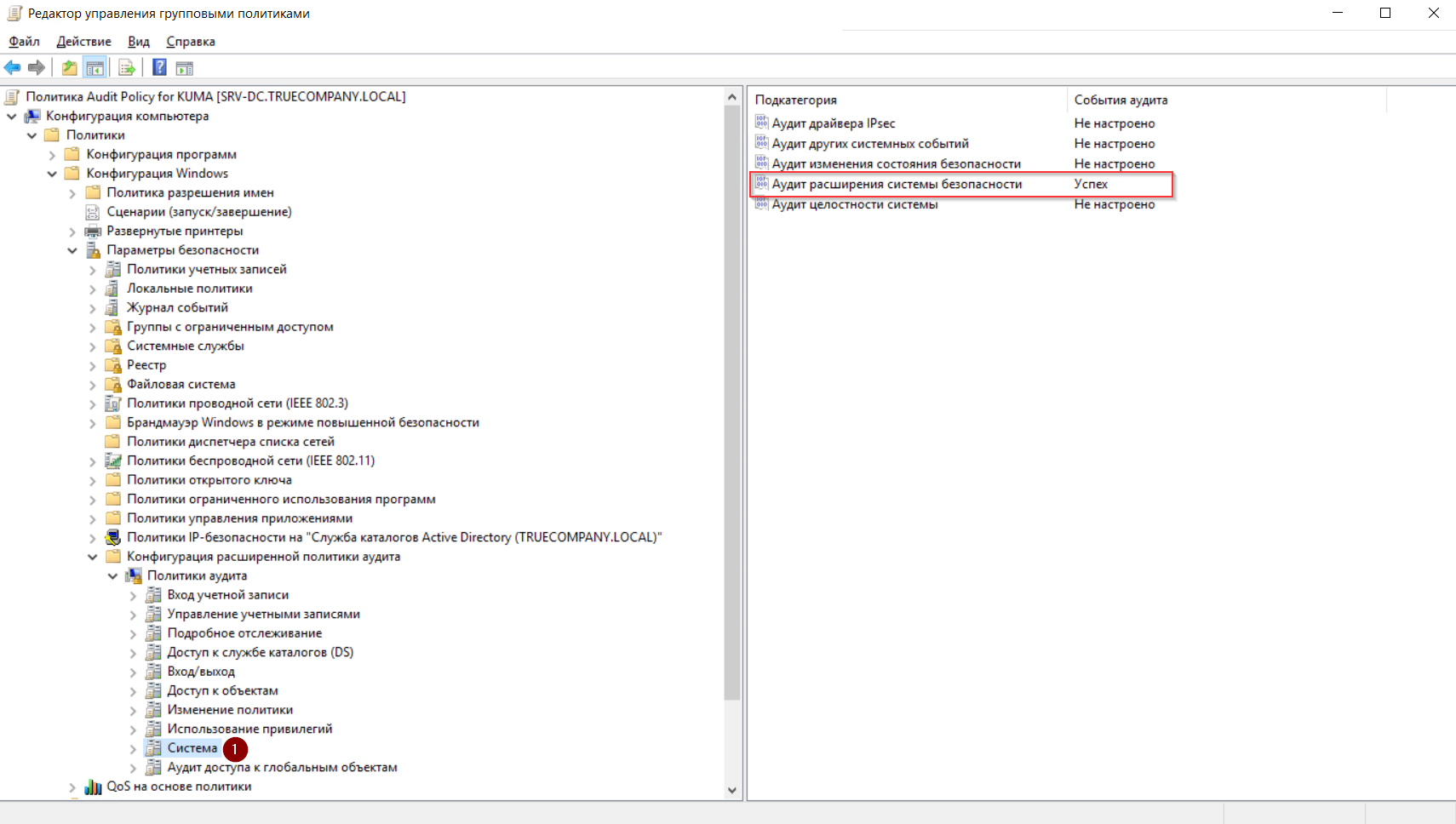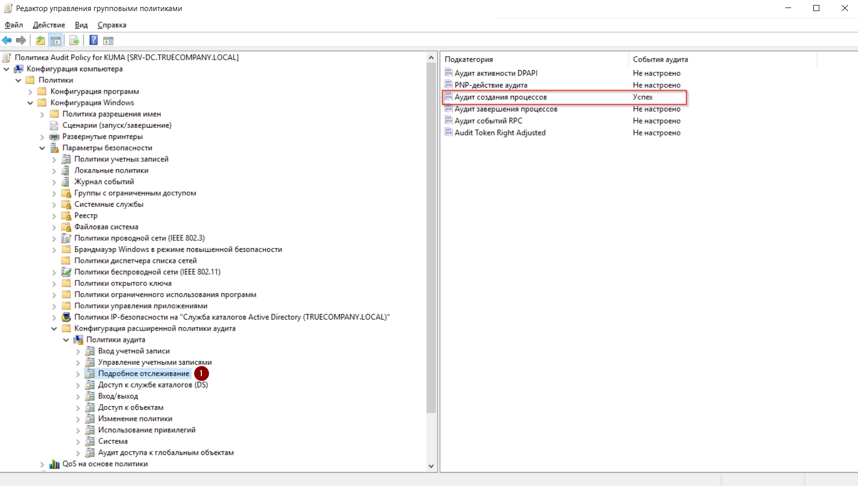 Рекомендуется настраивать политику аудита Windows, исходя из перечня событий аудита, которые нужны для работы «коробочных» правил корреляции KUMA (например, вход в систему, запуск процессов и т.д.). При необходимости перечень журналируемых событий аудита в дальнейшем можно расширить.