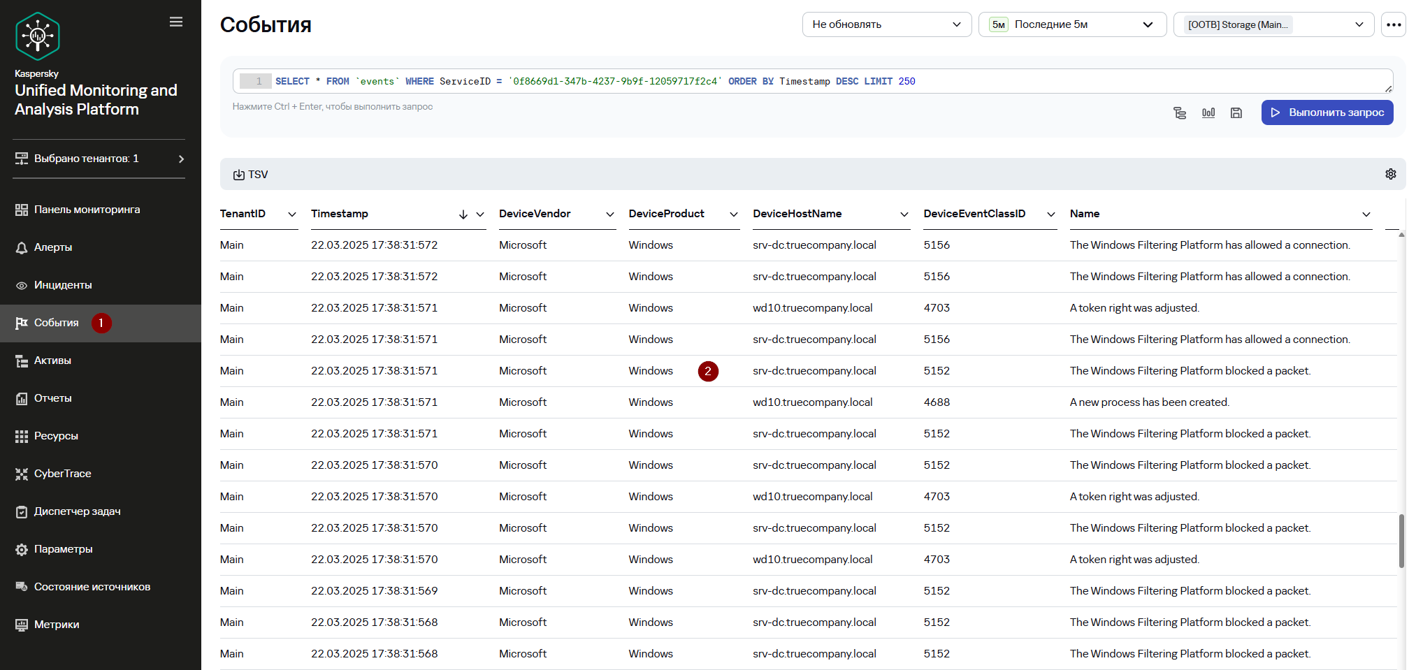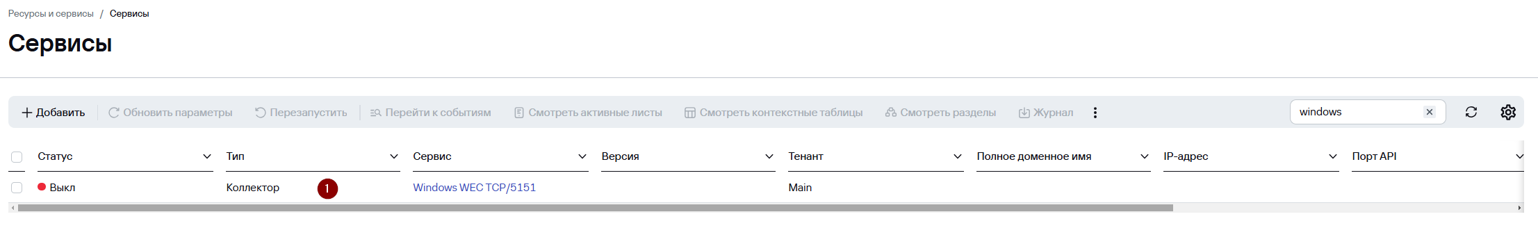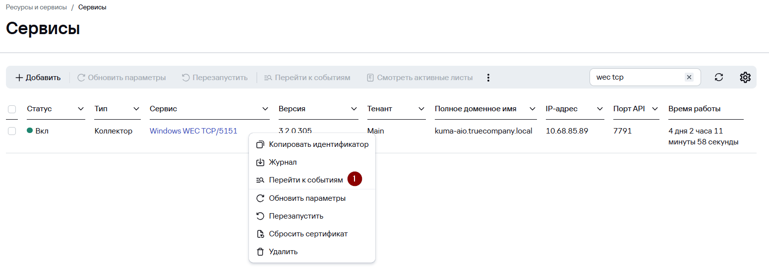- Для проверки, что сбор событий Windows успешно настроен перейдите в Ресурсы → Активные сервисы → выберите ранее созданный коллектор для событий Windows и нажмите Перейти к событиям.