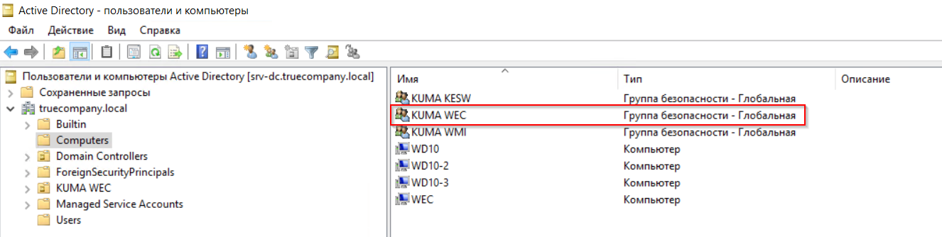 - Создайте группу компьютеров средствами Active Directory – пользователи и компьютеры, задайте имя группе, например, KUMA WEC. Добавьте в данную группу рабочие станции/серверы, с которых предполагается сбор событий.