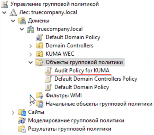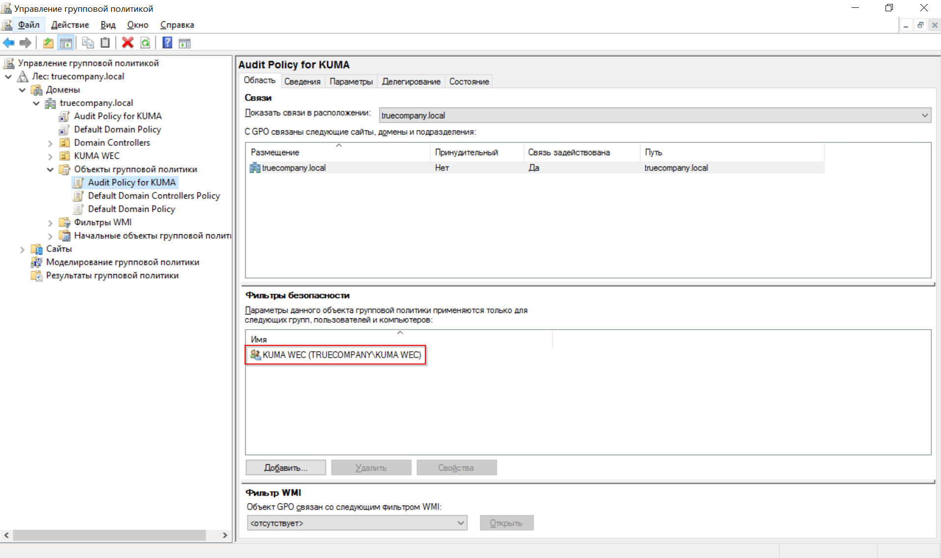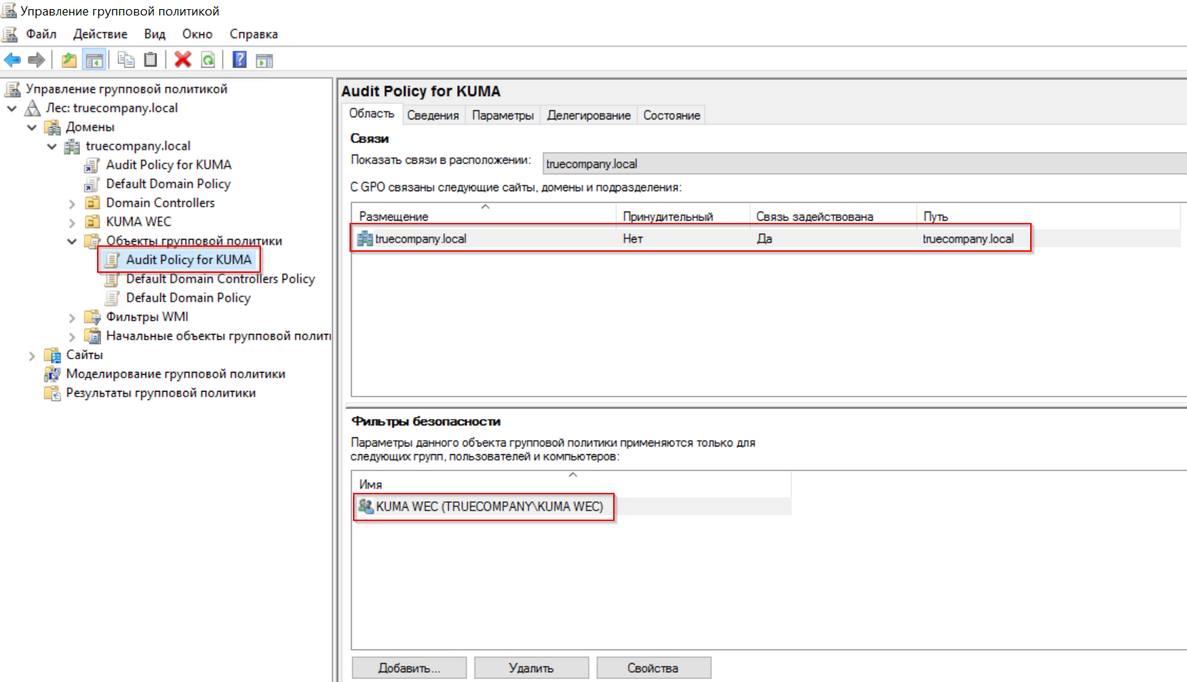 - Далее вернитесь в Управление групповой политикой → выберите объект групповой политики Audit Policy for KUMA → в окне справа Фильтры безопасности удалите группу Прошедшие проверку и добавьте группу KUMA WEC.