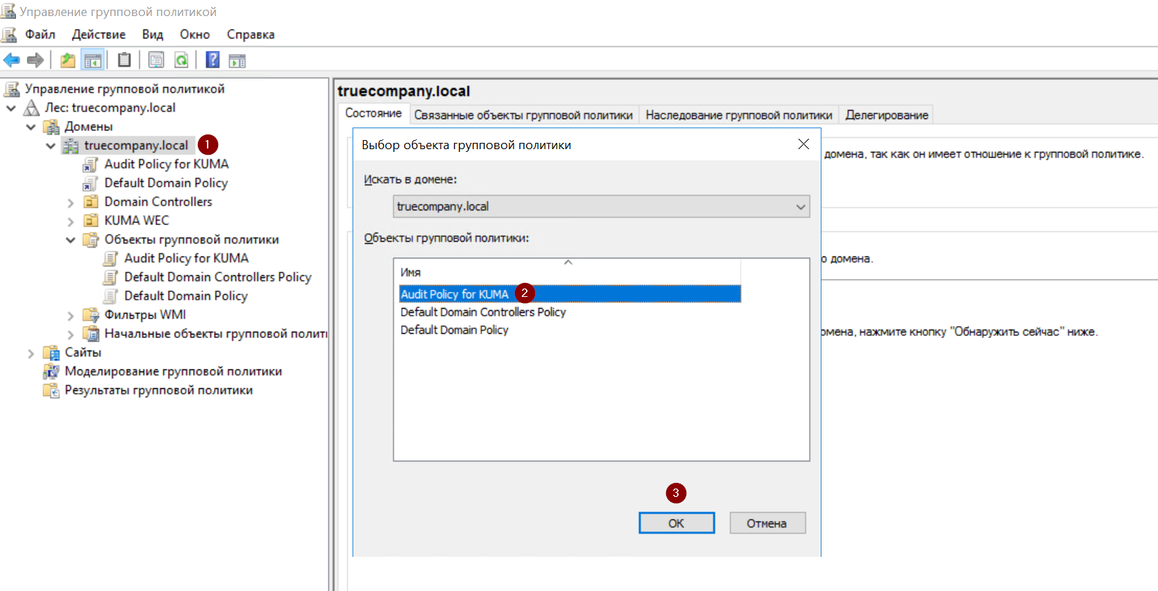 - Нажмите ПКМ на домен и выберите Связать существующий объект групповой политики → выберите Audit Policy for KUMA и нажмите ОК.