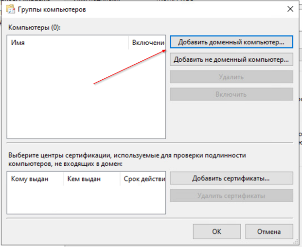 - Выберите группу устройств, события которой требуется собирать. В нашем примере – это ранее созданная группа KUMA WEC: нажмите Выбрать группы компьютеров → Добавить доменный компьютер → в поле Введите имена выбираемых объектов укажите ранее созданную группу компьютеров и нажмите ОК.