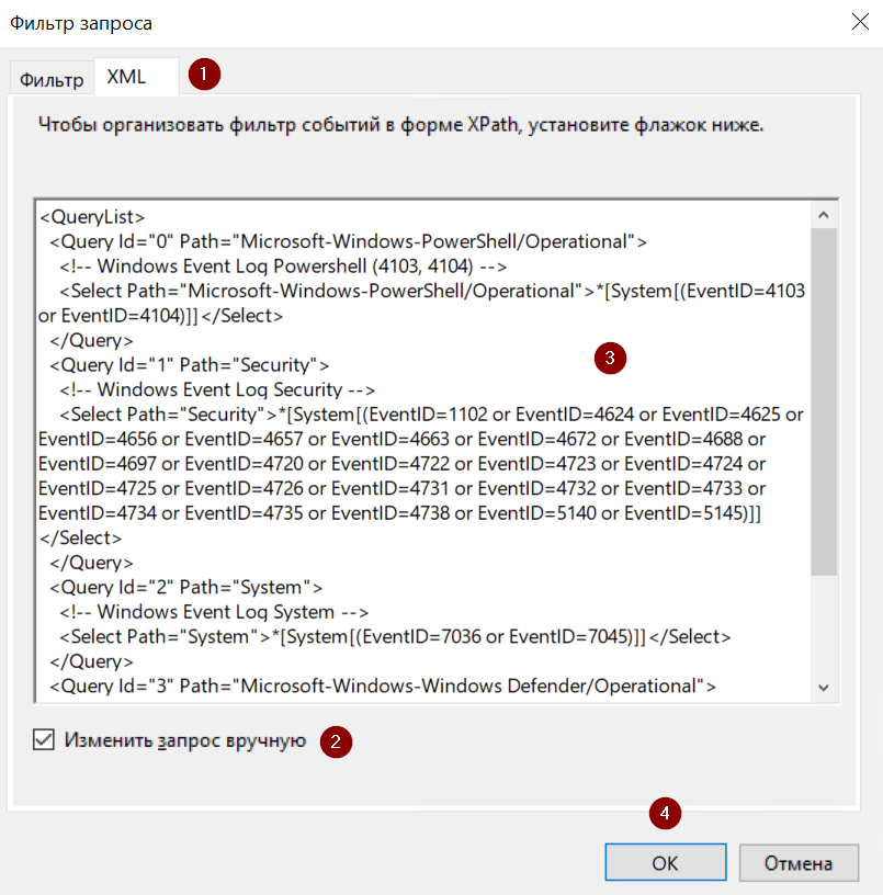 Перечень событий аудита Windows, используемых в "коробочных" правилах корреляции: