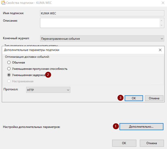 - Выберите Подписки → правой кнопкой мыши Создать подписку → Укажите имя подписки, например, KUMA WEC и тип подписки Инициировано исходным компьютером.