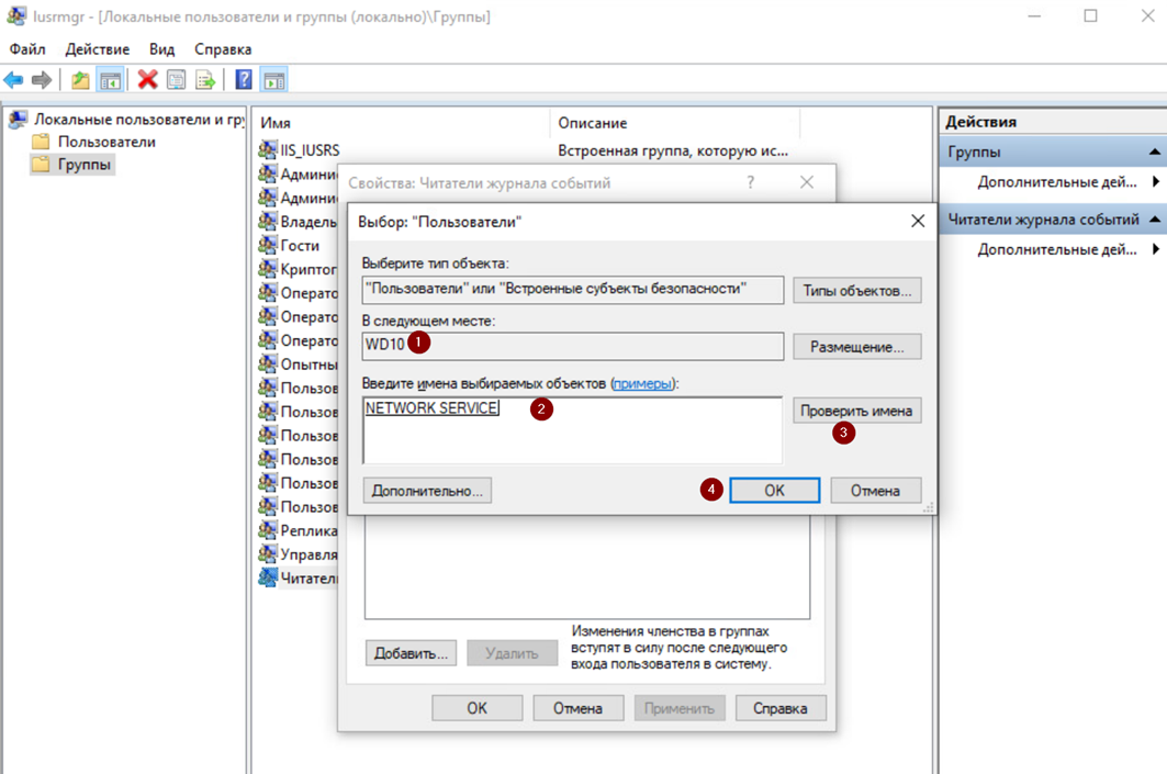 - Назначьте sMSA права Входа в качестве службы (Log on as a service) и добавьте в группу Читатели журнала событий (Event Log Readers)