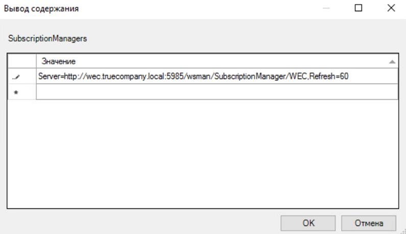 - Windows Event Collector или WEC-сервер - сервер, с запущенной службой «Сборщик событий Windows». Данный сервер на основании создаваемых подписок на события получает события от источников и обеспечивает их локальное хранение. Взаимодействие между WEC-сервером и источниками событий осуществляется с использованием протокола удаленного управления Windows (WS-Management protocol). Для настройки доступно два типа подписок: