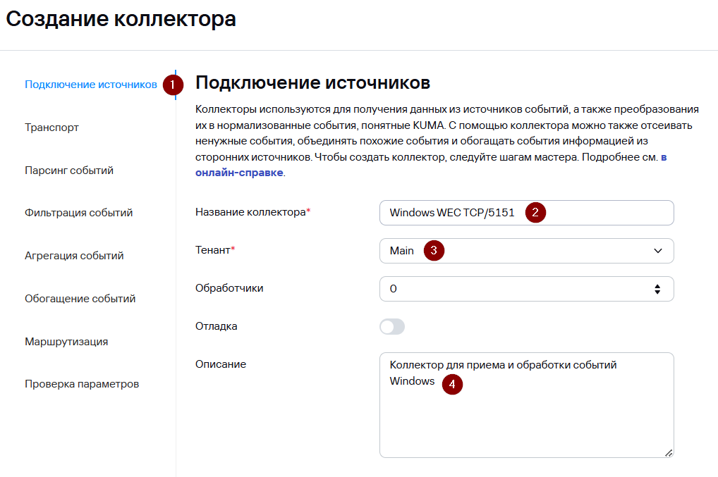 - К Коллектору KUMA, предназначенного для приема и обработки событий Windows. Порт и протокол, указанные при создании Коллектора (см. Раздел Создание коллектора KUMA).