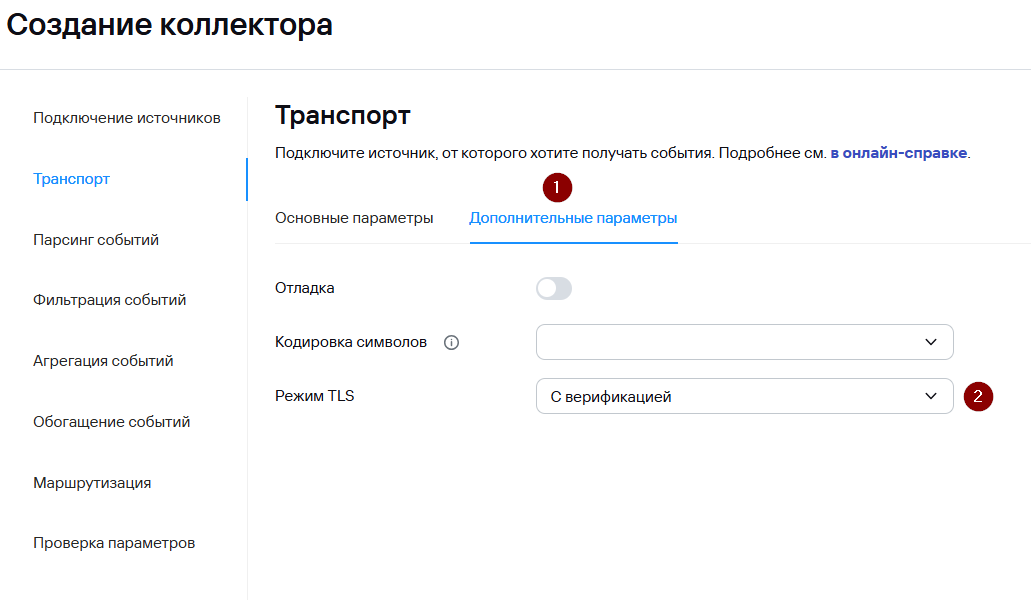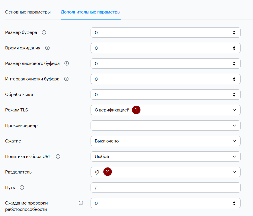 - Перейдите на вкладку Дополнительные параметры и для шифрования передаваемых данных между агентом и коллектором выберите Режим TLS - С верификацией. Также укажите в качестве Разделителя /0.