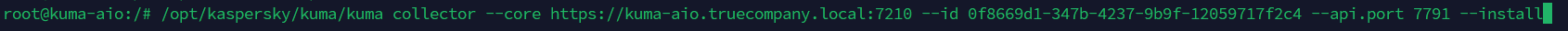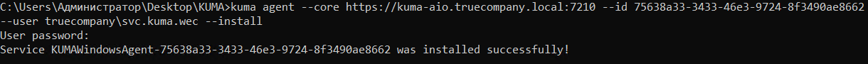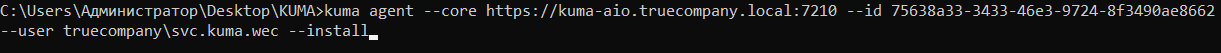 kuma agent --core https://<полное доменное имя сервера ядра KUMA>:<порт, используемый сервером ядра KUMA для внутренних коммуникаций (по умолчанию используется порт 7210)> --id <идентификатор сервиса агента, созданного в KUMA> --user <имя пользователя, под которым будет работать агент, включая домен, в формате domain\username> --install