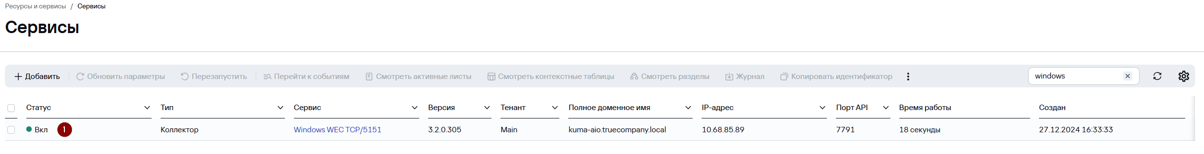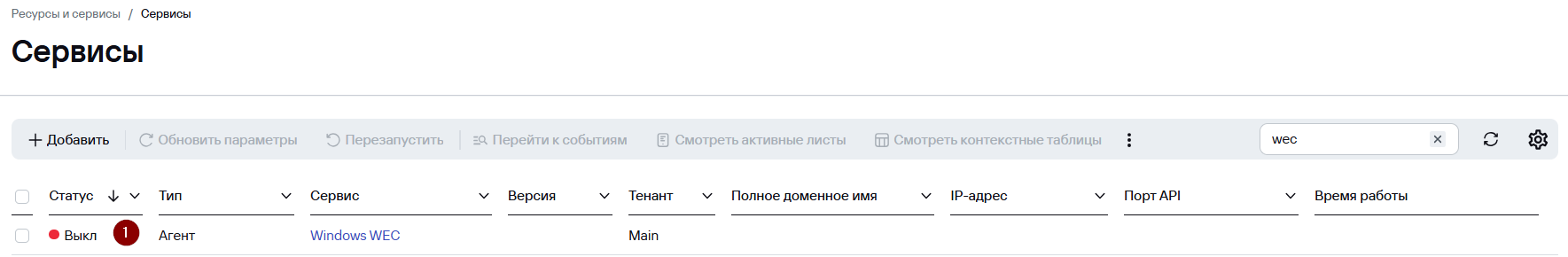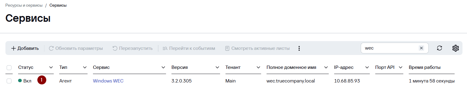 Далее перейдите в веб-интерфейс KUMA и убедитесь в успешности запуска агента - статус сервиса агента KUMA WEC должен измениться на ВКЛ с зеленой индикацией.
