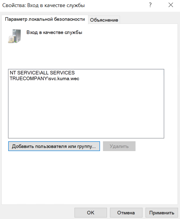 права Вход в качестве службы (Log on as a service) назначаются автоматически