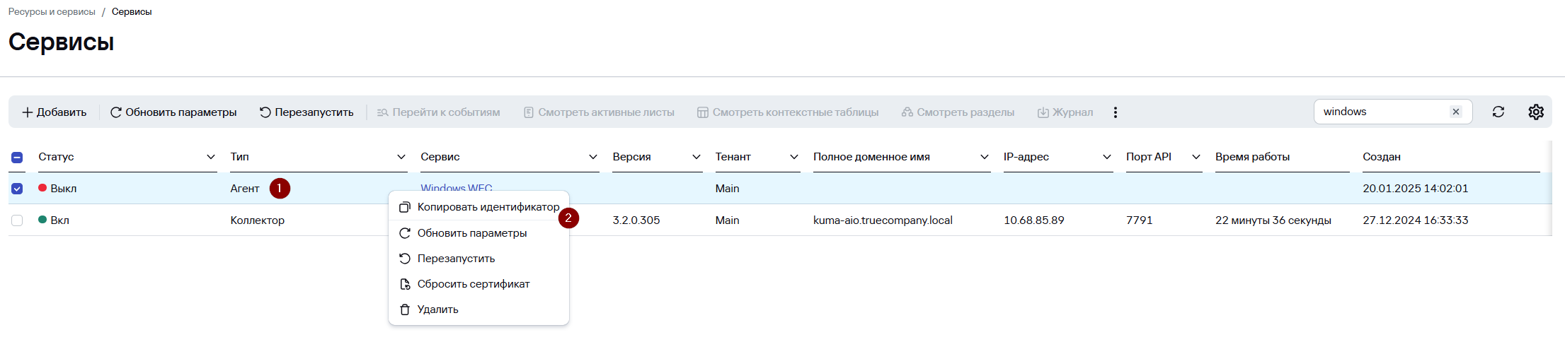 - Сервис агента создан в веб-интерфейсе KUMA и отображается в разделе Ресурсы → Активные сервисы. Теперь сервис агента необходимо установить на WEC-сервере для сбора событий Windows.