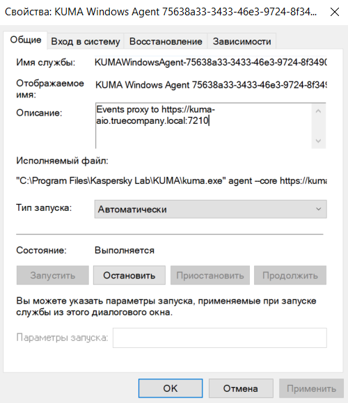 - В процессе установки будет создана папка C:\ProgramData\Kaspersky Lab\KUMA\agent\<идентификатор агента>, в которую будет установлен сервис агента KUMA.
