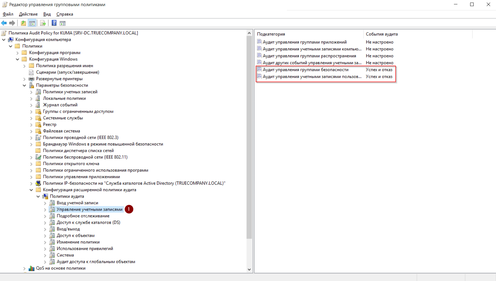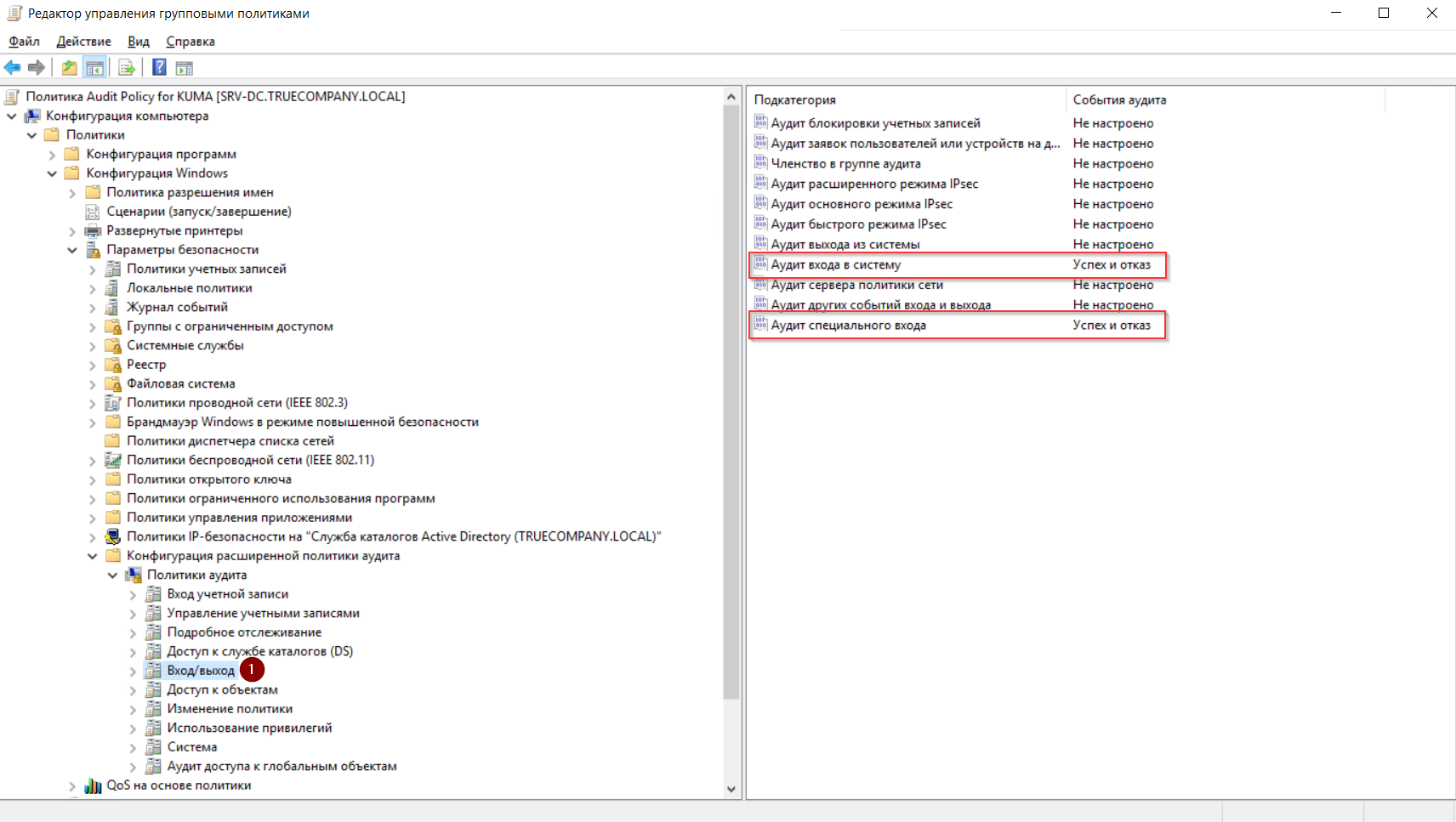 Чтобы настроить аудит событий, связанных с входами пользователей, аутентификацией, доступом к ресурсам, изменениями учетных записей и т.д.:
