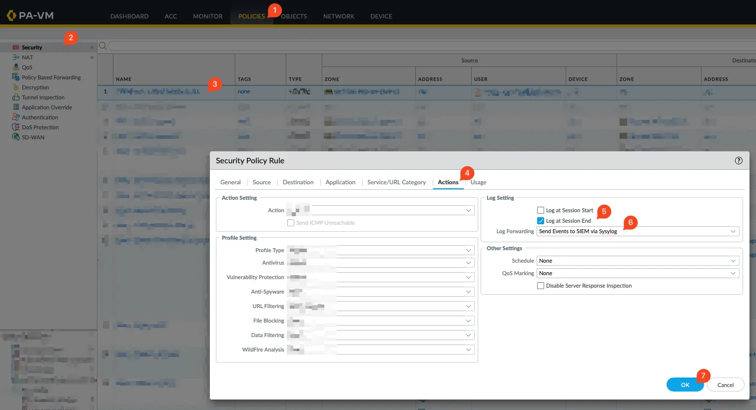 Для того, чтобы NGFW логировал события о сетевых сессиях и мог их передать на внешний Syslog-сервер необходимо включить логирование в правилах FW.