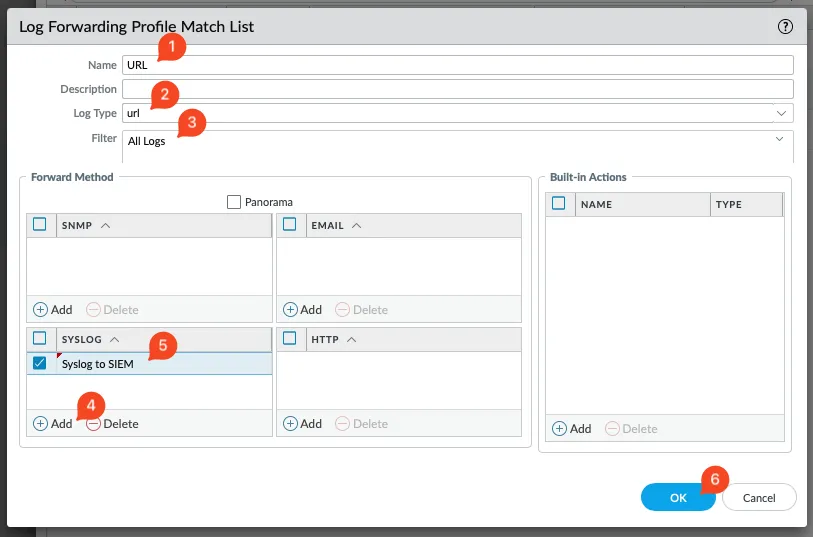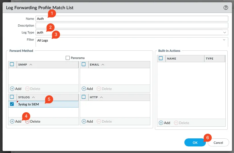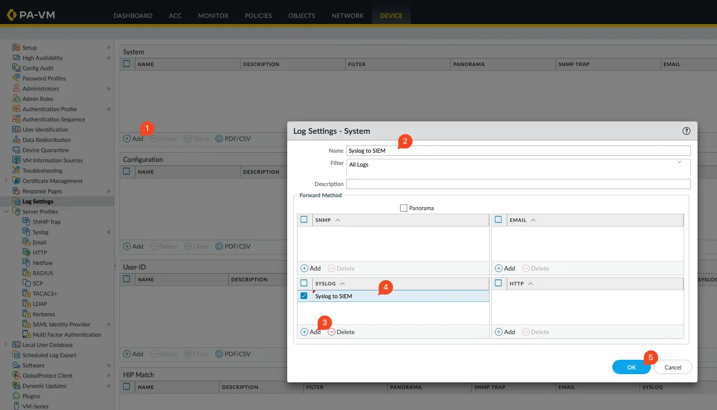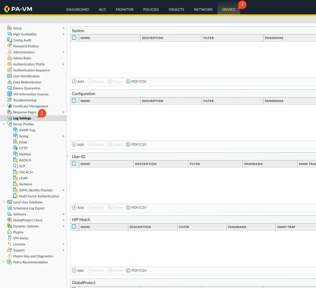 - Syslog - в данном разделе добавьте ранее созданный Syslog Server Profile