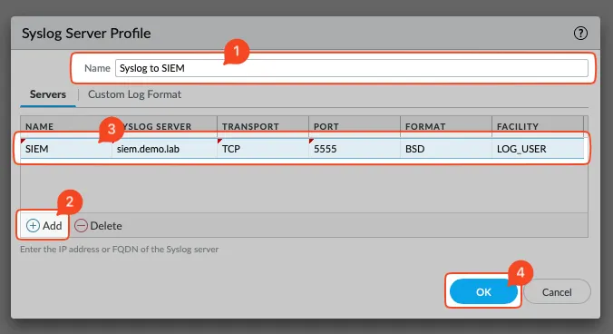 2. В окне создания профиля (Syslog Server Profile) укажите удобное имя в поле “Name” и нажмите “Add” для добавления Syslog-сервера, в параметрах сервера укажите: