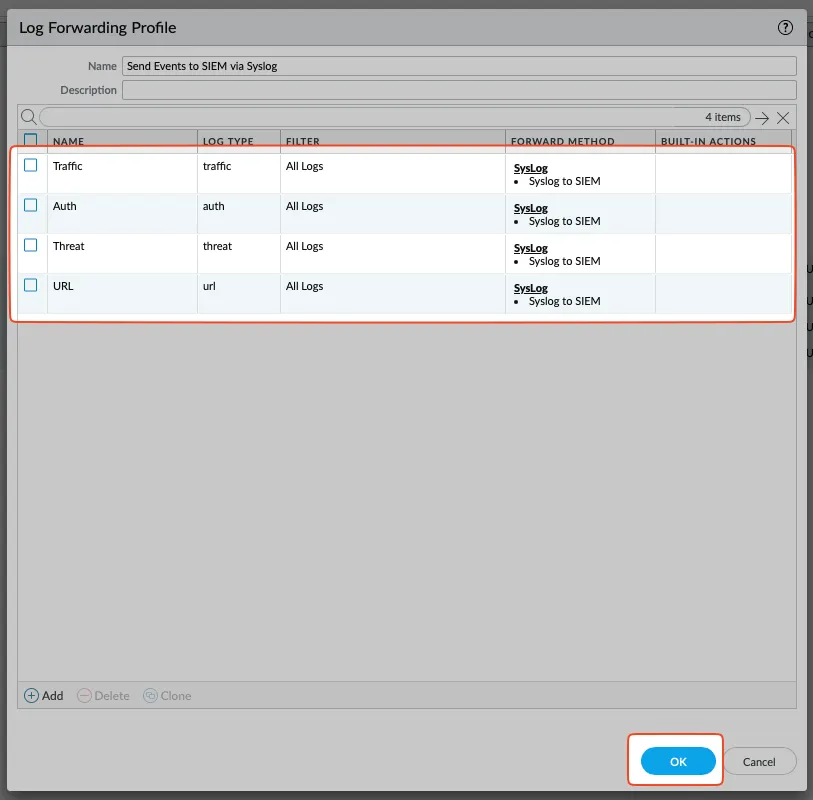 - В результате, в окне Log Forwarding Profile, у вас должно быть 4 списка соответствия, для сохранения нажмите “OK”