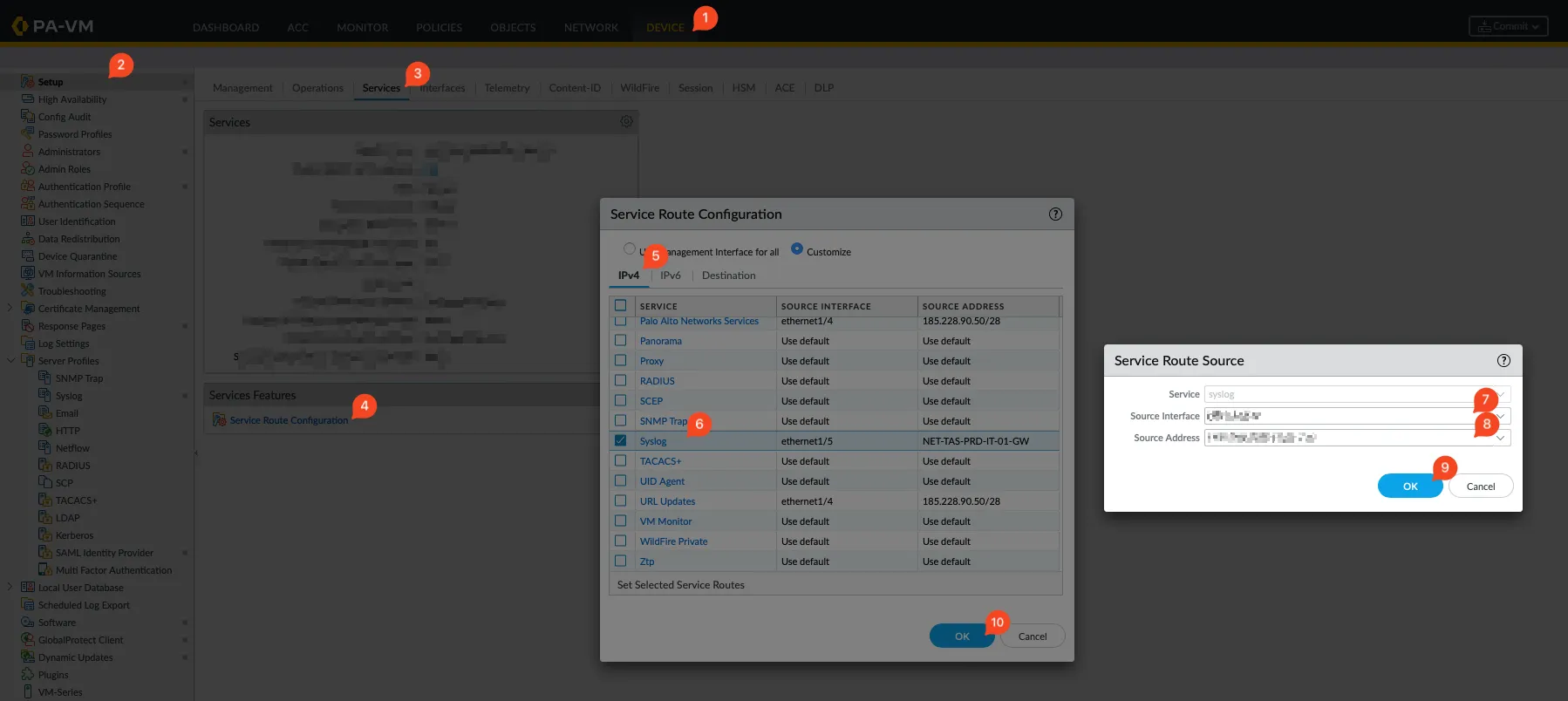 В открывшемся окне (Service Route Configuration), во вкладке IPv4 выберите “Syslog”