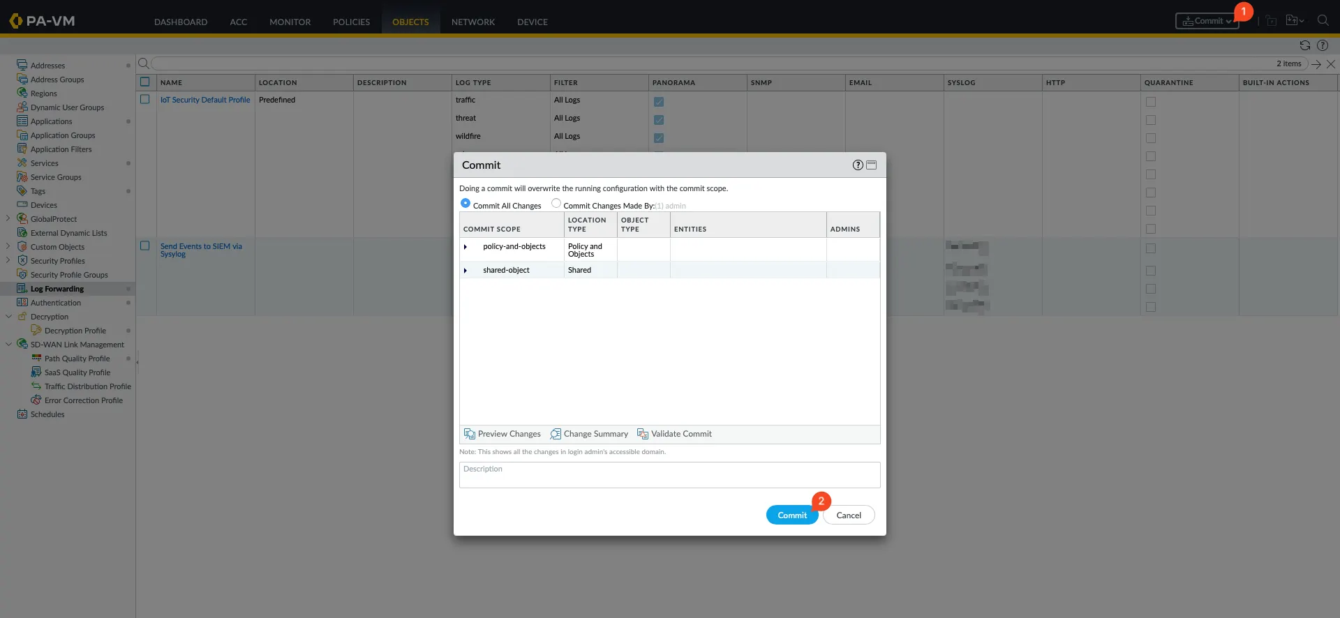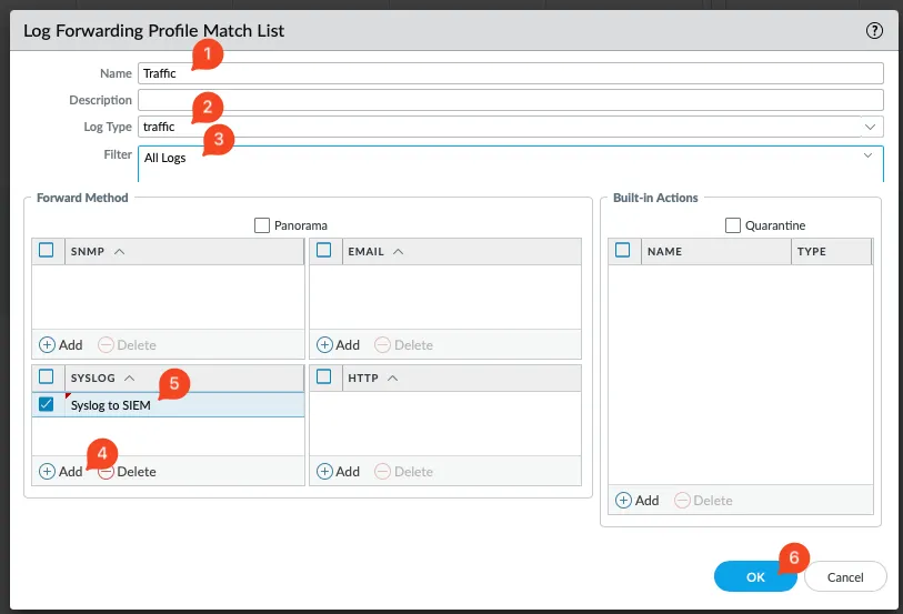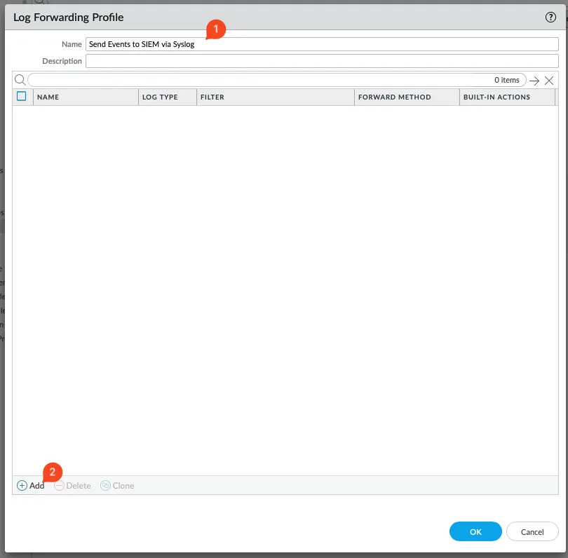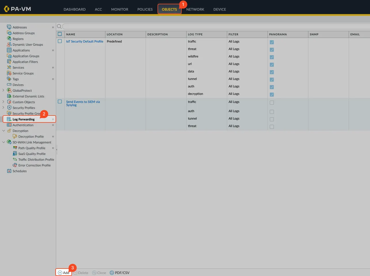 - Перейдите в раздел “Objects” → “Log Forwarding”, нажмите “Add” для добавления нового профиля
