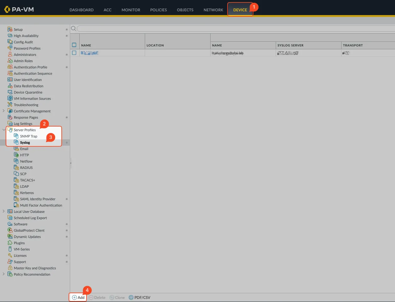 - Перейдите в раздел “Device” → “Server Profiles” → “Syslog”, нажмите “Add” для добавления нового профиля.