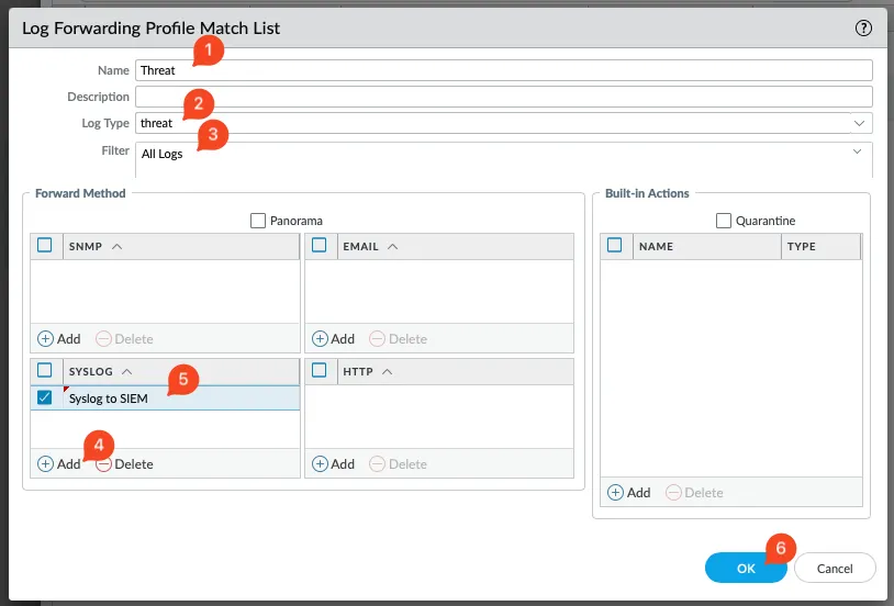 5. Добавьте список соответствия для событий об угрозах (threat), для этого в окне добавления списка соответствия (Log Forwarding Profile Match List) укажите: