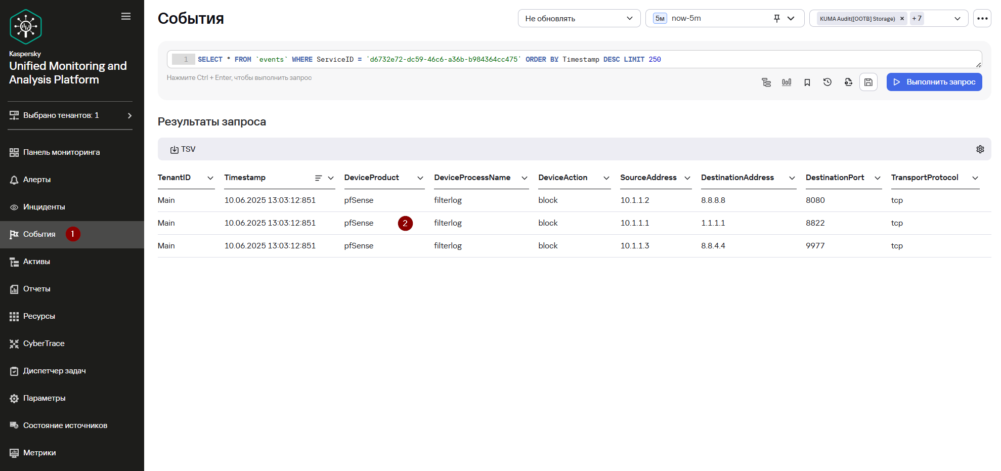 Для проверки, что сбор событий с pfSense успешно настроен перейдите в Ресурсы > Активные сервисы > выберите ранее созданный коллектор pfSense > ПКМ > Перейти к событиям.