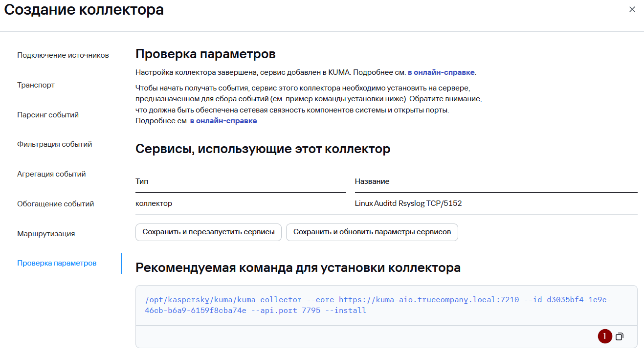 - Для установки сервиса коллектора в командной строке выполните команду под учетной записью root, скопированную на прошлом шаге.