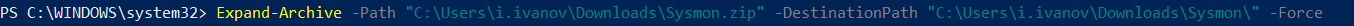 Expand-Archive -Path "<Путь, куда был загружен файл>\<Имя файла>" -DestinationPath "<Путь для распаковкизагрузки файла>\<Имя файла>" -Force