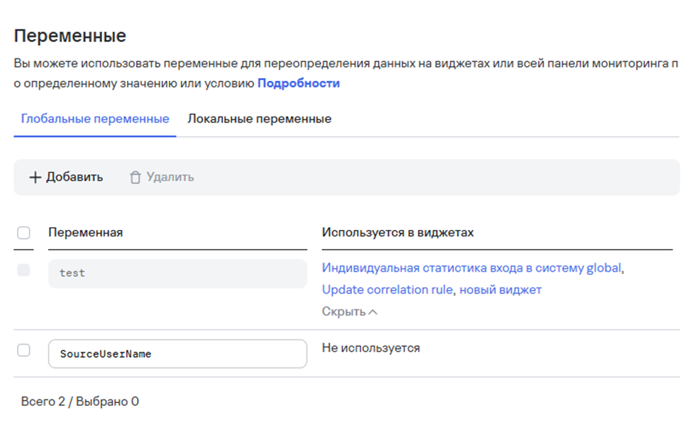 В параметрах “Переменные” добавьте глобальные переменные, которые смогут применяться к нескольким виджетам. Параметр “используется в виджетах” обновляется после привязки к ним, изначально имеет статус “Не используется”