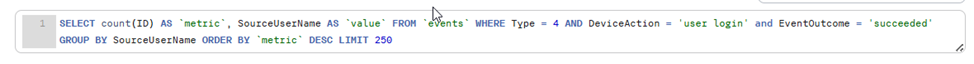 SELECT count(ID) AS `metric`, SourceUserName AS `value` FROM `events` WHERE Type = 4 AND DeviceAction = 'user login' and EventOutcome = 'succeeded' GROUP BY SourceUserName ORDER BY `metric` DESC LIMIT 250