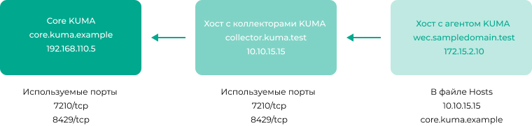 Для обращения агента KUMA к серверу Core используются порты 7210/tcp и 8429/tcp