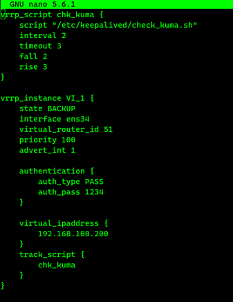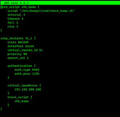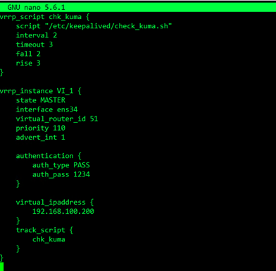 далее настройте keepalived. Создайте или отредактируйте файл /etc/keepalived/keepalived.conf на каждом узле. Ниже представлена адаптированная конфигурация.
