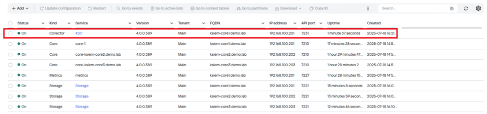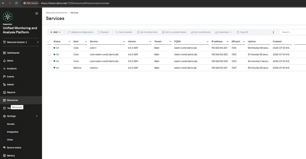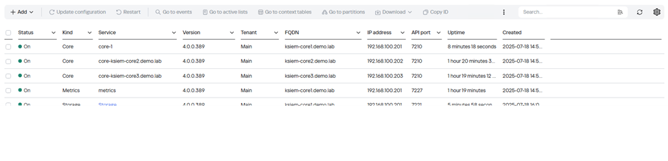 Зайдите в веб-интерфейс KUMA через VIP FKDN (ksiem.demo.lab) активируйте KUMA и убедитесь, что все ноды сервисов установлены и их статус “зеленый”