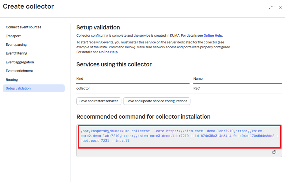 sudo /opt/kaspersky/kuma/kuma core --raft.join <FQDN хоста из секции kuma_core, где запущен первый сервис Ядра KUMA>:7210 --id <идентификатор сервиса Ядра KUMA, скопированный в веб-интерфейсе> --install