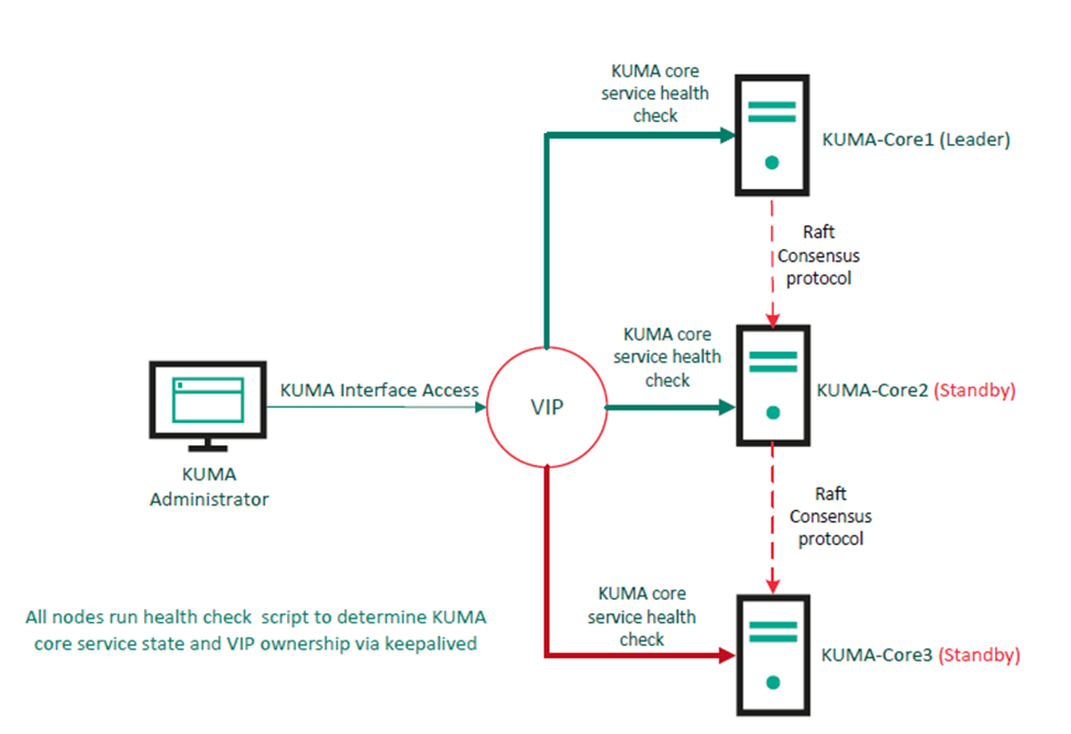 Кластер RAFT поддерживается в KUMA с версии 4.0 и позволяет обеспечить доступность компонентов ядра KUMA, в случае сбоя работы одного из компонентов. Допустимо развертывать только нечетное количество сервисов Ядра KUMA.